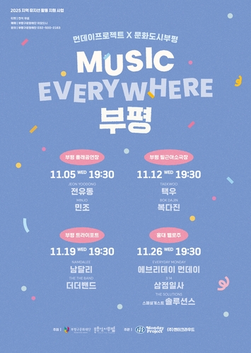 부평구(구청장 차준택) 문화재단 문화도시센터는 오는 11월 매주 수요일 오후 7시 30분 지역 뮤지션들의 공연 'MUSIC EVERYWHERE 부평'을 총 4회에 걸쳐 진행한다고 밝혔다.