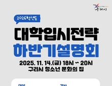 구리시(시장 백경현)는 '2026학년도 대학입시 전략 하반기 설명회' 참석자를 오는 10월 17일부터 구리시 통합예약 포털을 통해 선착순 110명까지 신청받는다고 밝혔다. 이번 설명회는 오는 11월 구리시청소년문화의집에서 열리며, 지역 학생과 학부모를 대상으로 변화하는 입시제도에 대한 이해를 돕고, 맞춤형 진학 전략을 안내하기 위해 마련됐다. 이번 하반기 설명회는 아래와 같이 총 3회에 걸쳐 진행된다. ○ 11월 14일 : '2029학년도 대입전형 및 입시 전략' (윤윤구 강사) ○ 11월 19일 : '2027학년도 대입전형의 이해와 대비' (조만기 강사) ○ 11월 21일 : '2027학년도 대입전형의 이해 및 효율적 지원전략' (김성길 강사) 참석 대상은 관내 중학교 3학년 및 고등학교 1·2학년 학생과 학부모이며, 강의는 약 2시간 동안 진행된다. 설명회 후에는 참석자들의 궁금증을 해소하는 질의응답 시간도 마련될 예정이다. 백경현 구리시장은 "구리시는 2021년부터 매년 대학입시 전략 설명회를 운영하며, 자녀들의 진로 준비를 돕기 위해 힘써왔다"라며, "이번 설명회가 변화하는 입시제도를 이해하고, 우리 아이들의 미래를 위한 전략을 세우는 유익한 시간을