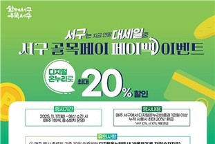 광주광역시 서구(구청장 김이강)는 오는 17일부터 디지털 온누리상품권로 결제 시 최대 20%의 할인 혜택을 받을 수 있는 '서구 골목페이 이벤트'를 단독으로 실시한다고 밝혔다. 이번 행사는 골목상권 활성화와 주민 생활비 절감을 위해 추진되며, 지난 10일로 조기 종료된 디지털 온누리상품권 10% 선할인 정책의 공백을 보완하기 위해 기획됐다. 서구는 이번 이벤트에 예산 6억원을 투입, 예산 소진 시까지 일주일 단위로 6회에 걸쳐 환급행사를 진행한다. 관내 온누리상품권 가맹점에서 디지털 온누리상품권으로 1만원 이상 결제 시 결제금액의 10%, 회차별로 최대 2만원까지 환급받을 수 있다. 또한 광주광역시의 10% 환급행사와 연계할 경우 소비자는 최대 20% 할인 혜택을 받을 수 있어 전국에서 유일하게 20% 혜택이 유지되는 지방정부가 됐다. 소비자는 서구에서 일주일에 온누리상품권 20만원을 소비하면 4만원을 되돌려받을 수 있으며, 서구는 이번 행사로 약 120억원 규모의 지역경제 파급효과를 기대하고 있다. 앞서 서구는 지난 3일 소상공인시장진흥공단 광주전남제주지역본부, 한국조폐공사와 함께 디지털온누리 환급사업 추진을 위한 업무협약을 맺고 원활한 사업 추진을 약속했