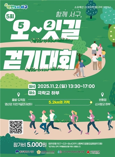 광주광역시 서구(구청장 김이강)는 11월2일 극락교 하부(서창둑길 377) 일대에서 '제5회 함께 서구, 오∼잇길 걷기대회'를 개최한다. '오잇길'은 '오(5)천원의 나눔으로 우리 이(2)웃의 희망을 잇는 5.2㎞의 길'이라는 의미로, 이번 대회는 가족돌봄청년을 지원하기 위해 열리는 서구 대표 주민참여형 나눔 축제다.