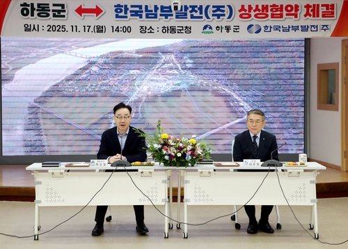 하승철 하동군수와 김준동 한국남부발전(주) 사장이 지난 17일 하동군청에서 만나 하동화력발전소 폐쇄에 대비한 지역사회 상생협력을 위한 협약을 체결했다.