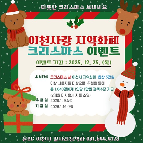이천시(시장 김경희)는 연말 소비 촉진과 지역경제 활성화를 위해 12월 25일 크리스마스 당일 '2025 이천사랑지역화폐 크리스마스 특별 이벤트'를 추진한다고 밝혔다.