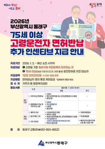 부산 동래구(구청장 장준용)는 고령 운전자 교통사고를 예방하고 안전한 교통 환경을 조성하기 위해 2026년부터 '고령 운전자 운전면허 자진 반납 추가 인센티브 지급 사업'을 추진한다고 밝혔다.