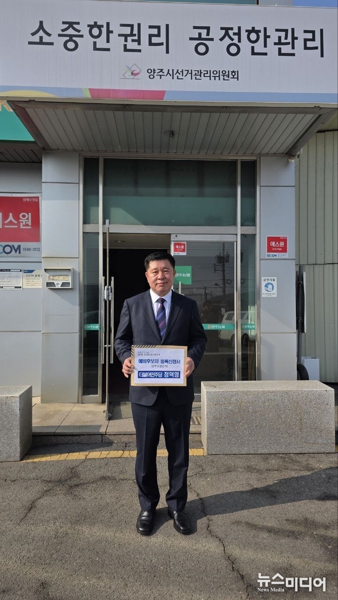 정덕영 전 양주시의회 의장이 2월 20일(금) 오전, 양주시장 선거 예비후보 등록 첫날 양주시선거관리위원회를 방문해 예비후보 등록을 완료했다고 밝혔다.