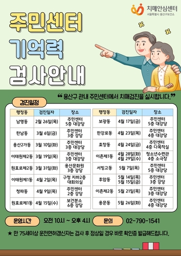 검사 대상은 치매 진단을 받지 않은 용산구 주민이며, 1인당 연 1회 무료로 참여할 수 있다.