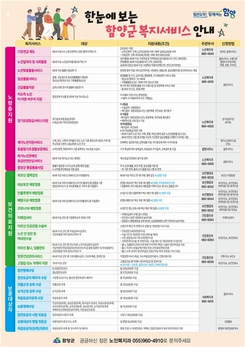 함양군은 지역 어르신들이 다양한 복지서비스를 보다 쉽고 편리하게 이용하실 수 있도록 '한눈에 보는 함양군 복지서비스 안내' 홍보물을 제작해 배포한다고 밝혔다.