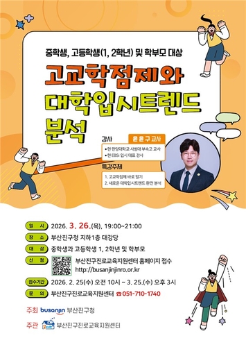 부산진구(구청장 김영욱)는 오는 3월 26일 부산진구청 지하 1층 대강당에서 변화하는 교육환경에 선제적으로 대응하고 학생과 학부모에게 실질적인 진학 정보를 제공하기 위해 '고교학점제와 새로운 대입제도 설명회'를 개최한다.