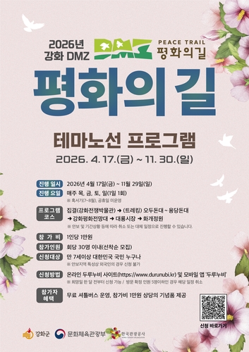 강화군(군수 박용철)은 오는 4월 17일부터 11월 30일까지 비무장지대(DMZ) 인근을 따라 조성된 'DMZ 평화의 길 테마 노선' 프로그램을 본격적으로 운영한다고 밝혔다.