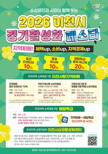 한편, 이천시에서 연말까지 진행하고 있는 '2026 이천시 경기활성화 페스타'의 주요 혜택 내용은 ①지역화폐 충전 시 인센티브 10% 지급(월10만 원 한도) ②작은가게(연매출 3억 원 이하 가맹점)에서 결제 시 10% 캐시백 지급[월 10만 원 한도 / 5월(가정의 달), 9월(추석달)은 전체 가맹점에서 결제 캐시백 혜택] ③배달특급에서 지역화폐 결제 시 추가 20% 캐시백 지급 혜택(월 2만 원 한도) 등이 있으며, 배달특급에서 지역화폐로 결제할 경우 최대 40%까지 할인되는 놀라운 혜택을 볼 수 있다.