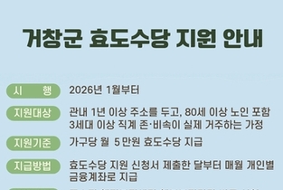 거창군은 경로효친의 건전한 가족제도 정착과 효 문화 확산을 위해 효도수당 지원 대상을 확대하고, 2026년 1월부터 본격 지급에 나선다. 이번 확대에 따라 효도수당은 관내에 1년 이상 주소를 두고 거주하며 만 80세 이상 어르신을 포함한 3세대 이상 동거가구를 대상으로 지급된다. 3세대 이상 가구란 본인 또는 배우자의 직계존속과 직계비속을 포함해 3세대 이상이 실제 거주하고 동일 주소지에 주민등록을 둔 가정을 말한다. 지원 요건을 충족한 가정은 주소지 읍면 행정복지센터 행복복지담당을 방문해 신청할 수 있으며, 신청한 달부터 요건이 유지되는 동안 매월 5만 원씩 연간 최대 60만 원의 효도수당을 받을 수 있다. 구인모 거창군수는 "효도수당 지원이 경로효친의 가치 확산과 건강한 가족문화 조성에 도움이 되길 바란다"며 "앞으로도 군민 생활과 밀접한 복지정책을 추진하겠다"고 말했다. 한편, 거창군은 그동안 4세대 이상 동거하는 가구에 대해 효도수당을 지원해 왔으나, 효 문화 확산과 가족 돌봄 기능 강화를 위해 지난해 관련 조례를 개정하고 지원 대상을 3세대 동거가구까지 확대했다. 이를 통해 많은 가정이 혜택을 받을 것으로 기대된다.