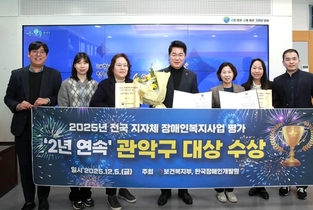 관악구(구청장 박준희)가 보건복지부 주관 '2025년 전국 지방자치단체 장애인복지사업 평가'에서 2년 연속 대상을 받는 영예를 안았다. 장애인복지사업 평가는 전국 229개 지자체의 장애인 복지 정책과 성과를 점검하고 우수사례를 확산해 장애인 복지사업의 효율적인 추진 기반을 만들고, 지역 장애인 복지 수준을 제고한다. 구는 2021년 최우수상, 2023년 우수상, 2024년 대상에 이어 네 번째 수상하는 영예를 안고, 2년 연속 전국 1위 자리를 수성하며 '관악형 장애인 복지정책'의 우수성을 재차 입증했다. 구는 '누구도 소외되지 않고 모두가 행복한 관악'을 비전으로 체계적이고 선도적인 장애인 복지 도시 구현에 행정력을 집중해 왔다. 특히 '지역 특성에 기반한 수요자 중심 서비스 환경 구축', '민관 협력 체계 활성화를 통한 통합돌봄 강화' 등 실질적인 지원책으로 장애인 삶의 질 향상에 기여해 높은 평가를 받았다. 올해 구는 장애인을 위한 '공간복지 실현'에 주안점을 두고, 실사용자인 장애인의 의견을 적극 반영해 '장애인단체 운영센터'를 새롭게 조성했다. '장애인종합복지관'에는 음악치료, 슐런 교실 등 많은 인원이 함께 이용할 수 있는 대규모 공간을 마련했다.