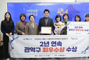 관악구(구청장 박준희)가 지난 15일 서울시 주관 '2025년 식품 위생·정책분야 종합평가'에서 최우수상을 수상하며, 지난해에 이어 2년 연속 수상의 영예를 안았다. 이로써 구는 2018년부터 올해까지 단 한 차례도 빠짐없이 우수 자치구에 이름을 올리며 '8년 연속 수상'(▲2018년 최우수상 ▲2019년∼2023년 우수상 ▲2024년∼2025년 최우수상)이라는 대기록을 달성했다. 이번 평가는 서울시 25개 자치구를 대상으로 식품안전관리 인프라와 식품접객업소 관리 등 위생 및 정책 전반에 대해 종합적으로 이루어졌다. 평가는 7개 분야 24개 세부 지표를 기준으로 이뤄졌으며, 관악구는 다양한 지표에서 전반적으로 고루 높은 점수를 획득했다. 특히, ▲식품 관련 업체 지도점검, 수거 검사, 민원 처리 ▲식생활 교육계획 수립 등 식생활 개선 문화 확산 ▲'덜 달달 9988' 시정 참여 등 11개 주요 지표에서 만점을 기록하며 독보적인 행정 역량을 입증했다. 이러한 성과는 전국에서 청년 인구 비율이 가장 높고(41%) 지속적인 1인 가구 증가와 외식 비중이 증가하는 변화된 식생활 여건에 선제적으로 대응해 온 결과로 풀이된다. 구는 외식 비중이 높은 구민들을 위해 위생
