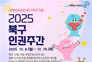광주광역시 북구(구청장 문인)가 올해로 77주년이 된 세계인권선언기념일을 맞아 오는 8일부터 16일까지를 '북구 인권 주간'으로 정하고 다채로운 행사를 펼친다고 4일 밝혔다. '세계인권선언'은 모든 인간은 동등하고 양도할 수 없는 권리를 가진다는 내용을 담고 있는 선언으로 1948년 12월 10일 국제연합 총회에서 채택된 이후 세계 각국에서는 매년 12월 10일을 '인권의 날'로 기념하고 있다. 북구에서도 '북구 인권보장 및 증진에 관한 조례'에 근거해 주민들과 세계인권선언의 가치를 공유하고 지역 내 인권 문화 확산을 위한 행사를 매년 추진하고 있다. 올해는 ▲찾아가는 인권 교육 ▲영화·책으로 만나는 인권 ▲인권이 보이는 라디오 ▲인권 네트워크 간담회 등 주민 참여형 프로그램을 운영할 예정이다. 이번 북구 인권 주간은 어린이와 노인을 대상으로 하는 '찾아가는 인권 교육'으로 문을 연다. 8일부터 이틀간 인권 교육 전문 강사가 어린이집과 노인복지관으로 방문해 연령별 눈높이에 맞춘 인권 교육을 제공한다. 9일에는 북구 평생학습관에서 영화 '프리 철수 리' 상영과 함께 보편적 인권의 의미를 되짚어보는 인권 강좌가 진행된다. 국가인권위원회 소속 강사가 세계인권선언의