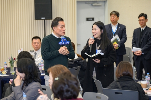 지난 18일 수원시농수산물도매시장 대회의실에서 열린 권선1동 새빛만남. 자녀가 효정초등학교에 다니는 학부모가 "사고 위험이 있는 등하굣길을 개선해 주셨으면 한다"고 건의했다.