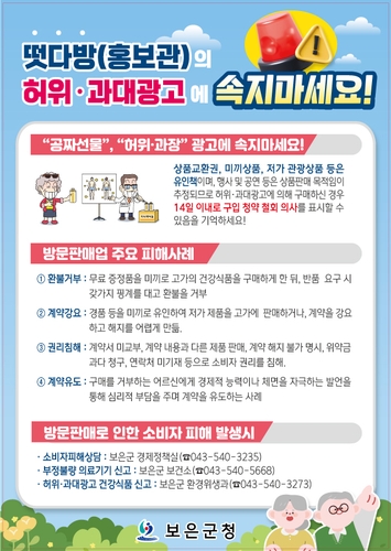 충북 보은군은 최근 방문판매업(홍보관) 운영과 관련해 노인을 중심으로 한 소비자 피해가 우려됨에 따라, 피해 예방을 위한 종합 대책을 마련하고 본격 추진에 나섰다고 4일 밝혔다.