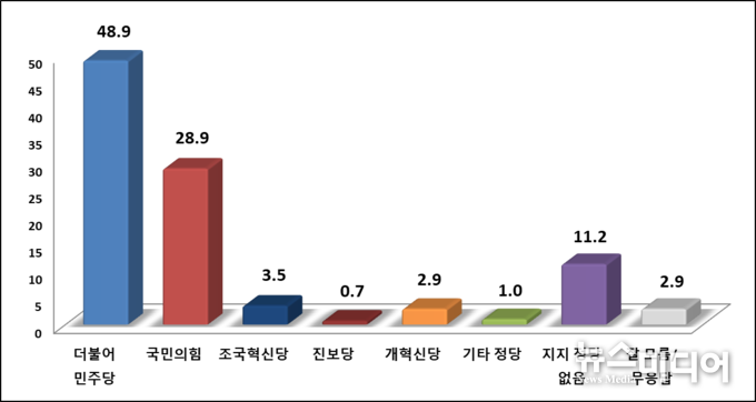 [정당 지지도]는 더불어민주당 48.9%, 국민의힘 28.9%, 조국혁신당 3.5%, 개혁신당 2.9%, 진보당 0.7%, 기타 정당 1.0%, 지지정당 없음 11.2%, 잘 모름/무응답 2.9%로 나타났다.