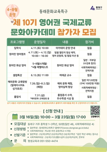 부산 동래구(구청장 장준용)는 글로벌 리더를 꿈꾸는 청소년들의 성장을 지원하기 위해 오는 4월부터 8월까지 5개월 과정의 '제10기 영어권 국제교류 문화 아카데미'를 운영한다고 밝혔다.