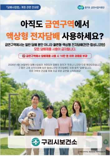 구리시 보건소는 '담배사업법' 및 '국민건강증진법' 개정으로 담배의 정의가 확대됨에 따라, 지역사회 내 담배 규제 사항을 점검하고 금연 문화를 확산하기 위해 4월 24일부터 금연 구역 점검·단속과 금연 홍보 운동을 한다고 밝혔다.