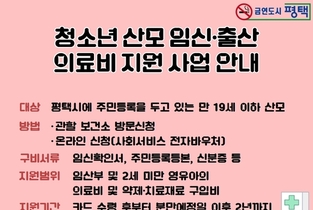 평택시(시장 정장선)는 임신과 출산을 준비하는 청소년 산모의 건강한 출산과 경제적 부담 완화를 위해 '청소년 산모 의료비 지원 사업'을 적극 추진하고 있다고 밝혔다. 본 사업은 19세 이하의 청소년 산모를 대상으로 임신 및 출산과 관련된 의료비와 약제비를 지원하는 제도로, 산모 1인당 최대 120만 원까지 국민행복카드 이용권(바우처) 형태로 지원된다. 지원 대상은 평택시에 주민등록이 돼 있는 청소년 산모로, 소득 수준과 관계없이 신청할 수 있으며, 임신 확인 후 평택·송탄보건소 또는 '사회서비스 전자바우처' 포털을 통해 온라인으로 신청하면 된다. 지원금은 산부인과 진료비, 검사비, 분만 관련 의료비 등 임산부 및 2세 미만 영유아의 의료비 및 약제·치료재료 구입비로 사용할 수 있다. 평택보건소 관계자는 "청소년 산모는 신체·정서·경제적으로 어려움을 겪는 경우가 많다"며 "이번 의료비 지원 사업이 안전한 출산 환경을 조성하고, 산모와 아기의 건강을 지키는 데 실질적인 도움이 되길 바란다"고 말했다. 한편, 청소년 산모 의료비 지원 사업 관련 자세한 사항은 평택보건소 모자건강팀(031-8024-4352), 송탄보건소 모자건강팀(031-8024-7291)에서 안내