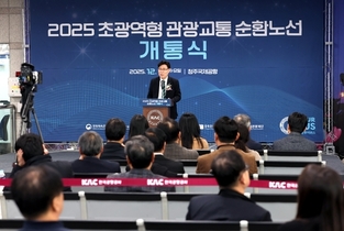 충북도는 10일(수) 청주국제공항과 KTX 오송역 그리고 충남 공주·부여를 연결하는 초광역형 관광교통 순환노선 공식 개통식을 개최했다고 밝혔다. 개통식은 이날 오후 청주국제공항에서 열렸으며, 이동옥 충북도 행정부지사, 조영미 문화체육관광부 관광 기반과 사무관, 최정훈 충북도의회 행정문회위원회 위원장, 조일교 충남도 문화체육관광국장, 충남북 지역 운수업계 등 주요 인사 50여명이 참석해 공동 사업의 의미를 공유하고, 사전축하공연, 경과보고, 축사와 기념사, 테이프 커팅 등 공식 행사를 통해 초광역형 관광교통망 출범을 선언했다. 참석자들은 청주국제공항과 오송역까지 약 30분간 시승하고 노선 특징 소개 등 탑승 체험 프로그램에 참여하며 신규노선의 이동 편의성을 확인했으며, 신규 순환노선의 경유지 최소화, 환승 없는 직행 노선 구성에 대해 긍정적인 반응을 보였다. 순환노선은 '청주국제공항∼오송KTX역∼공주터미널∼부여터미널'을 잇는 신규 시외버스 노선으로 충북도와 충남도가 공동으로 추진한 초광역형 관광교통 혁신 선도지구 사업의 1단계 성과다. 지난 10월 27일 첫 운행을 시작한 이후로 11월 말 기준 누적 이용객은 543명이다. 특히 청주국제공항의 이용객 증가세가