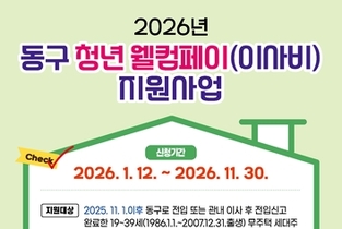 인천 동구(구청장 김찬진)는 청년의 주거비 부담 완화와 안정적인 정착을 위한 '청년 웰컴페이(이사비) 지원사업'을 추진한다고 밝혔다. 지원대상은 2025년 11월 1일 이후 동구에 전입신고를 완료한 19∼39세 무주택 세대주로서 가구당 건강보험료 기준 중위소득 150% 이하인 전월세 임차 계약자이다. 대상자에게는 40만원 한도 내 이사, 부동산 중개, 입주청소에 지출한 비용을 지원하며 오는 12일부터 인천청년포털(youth.incheon.go.kr) 온라인으로 신청하면 된다. 제출서류 등 지원사업에 대한 자세한 내용은 동구청 홈페이지 및 인천청년포털 내 사업 안내를 통해 확인할 수 있다. 김찬진 동구청장은 "청년들의 경제적 자립과 주거 안정을 도모하는 중요한 발판이 될 것이라 기대한다"며 "앞으로도 청년이 실제 체감할 수 있는 정책을 지속적으로 시행할 계획"이라고 말했다.