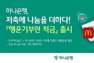 하나은행(은행장 이호성)은 기부문화 활성화를 위한 ESG 특화 금융상품 '행운기부런 적금'을 출시했다고 밝혔다. '행운기부런 적금'은 하나은행과 한국맥도날드의 생활금융 협력의 첫 결실로, 저축과 나눔이 자연스럽게 이어지는 따뜻한 손님 참여 경험을 제공하는 상품이다. 적금 만기 시 손님이 선택한 일정 금액이 기부로 연계돼 사회적 가치 창출에 기여할 수 있도록 설계된 것이 특징이다. 손님은 저축을 통해 자산 형성의 기반을 다지는 동시에 별도의 복잡한 절차 없이 저축의 성취를 나눔으로 확장할 수 있다. 기부금은 장기 치료가 필요한 환아와 가족을 지원하는 비영리 단체인 한국로날드맥도날드하우스(RMHC)로 전달된다. 하나은행은 손님의 기부 참여에 더해 나눔 실천에 동참한다. 손님이 적금 가입 시마다 좌당 1천원을 RMHC에 추가로 기부함으로써 손님과 함께 선한 영향력을 전파하고 포용적 사회를 만들어가는 공동 기부 모델을 구현했다. 내년 1월 말까지 3만좌 한정으로 판매 예정인 '행운기부런 적금'의 계약기간은 6개월이며, 가입 가능금액은 매월 5만원 이상 20만원 이하이다. 적용금리는 기본금리 연 2.0%에 ▲기부금 이체 우대 연 1.5% ▲하나 첫거래 우대 연 2.0